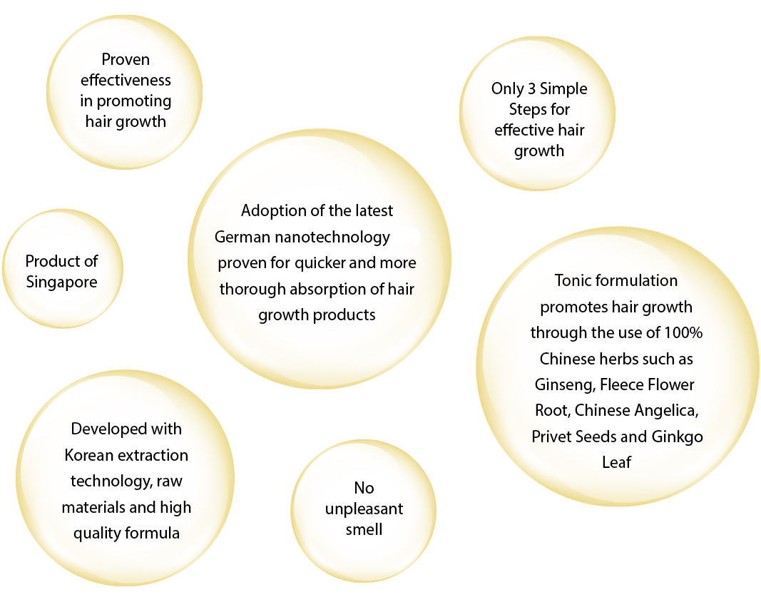• Tonic formulation promotes hair growth through the use of 100% Chinese herbs such as Ginseng, Fleece Flower Root, Chinese Angelica, Privet Seeds and Gingko Leaf